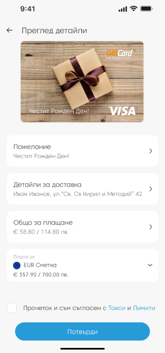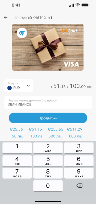Виртуалните карти GiftCard са чудесен начин да изненадаш близките си хора с перфектния подарък дори на далечни разстояния. Можеш да заредиш картата във валутата на основната ти сметка. Просто посочи желаната сума и избери получател. Целият процес от момента на поръчката до момента на получаването отнема броени секунди и картата може да се използва веднага.