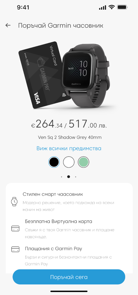 iCard и Garmin си партнират, за да ти предоставят още по-елегантен и безпрепятствен начин да извършваш мобилни плащания. Открий моделите смартчасовници Garmin в приложението iCard. Всички те са с включен Garmin Pay и идват с виртуална дебитна карта Garmin Pay, която можеш да свържеш към всяка от сметките си в iCard. Избери предпочитания модел и цвят и поръчай своя нов часовник Garmin още днес.