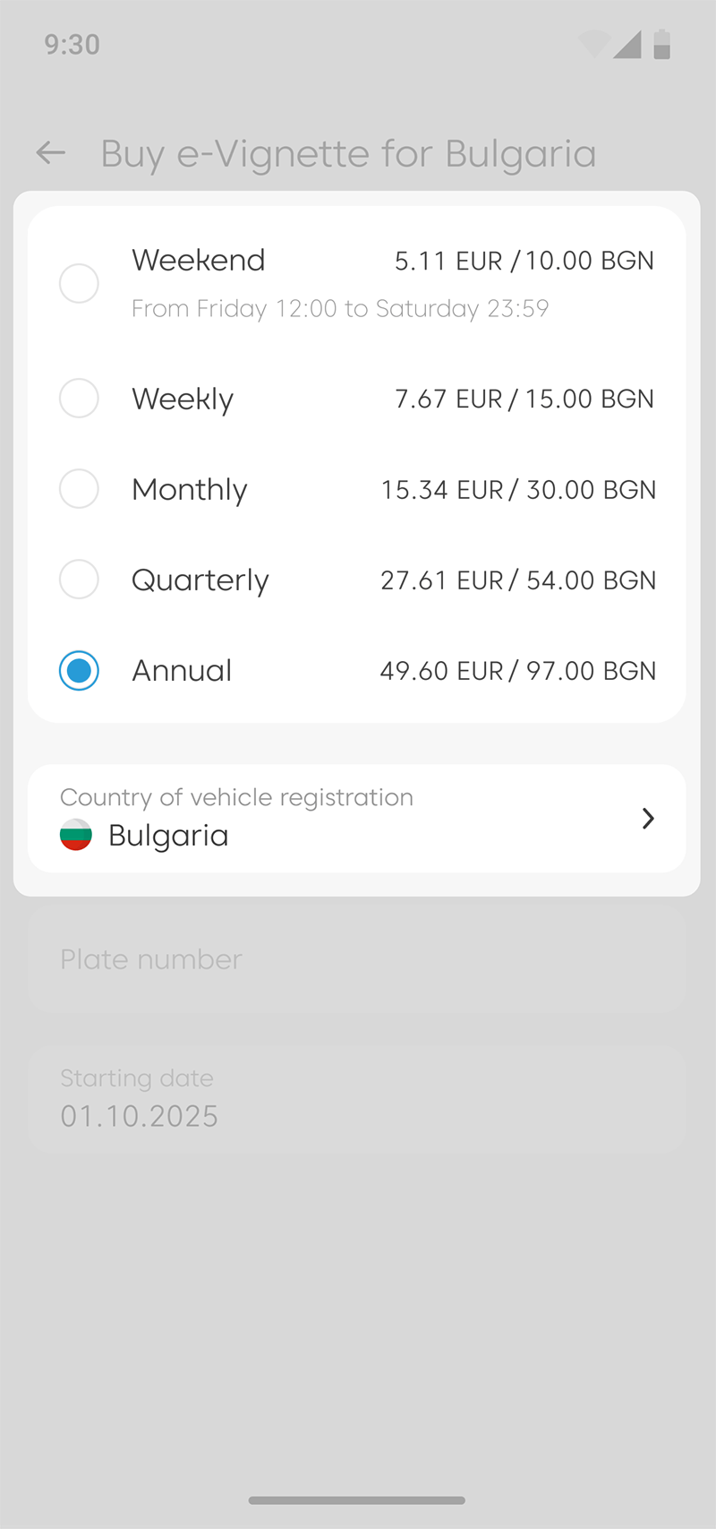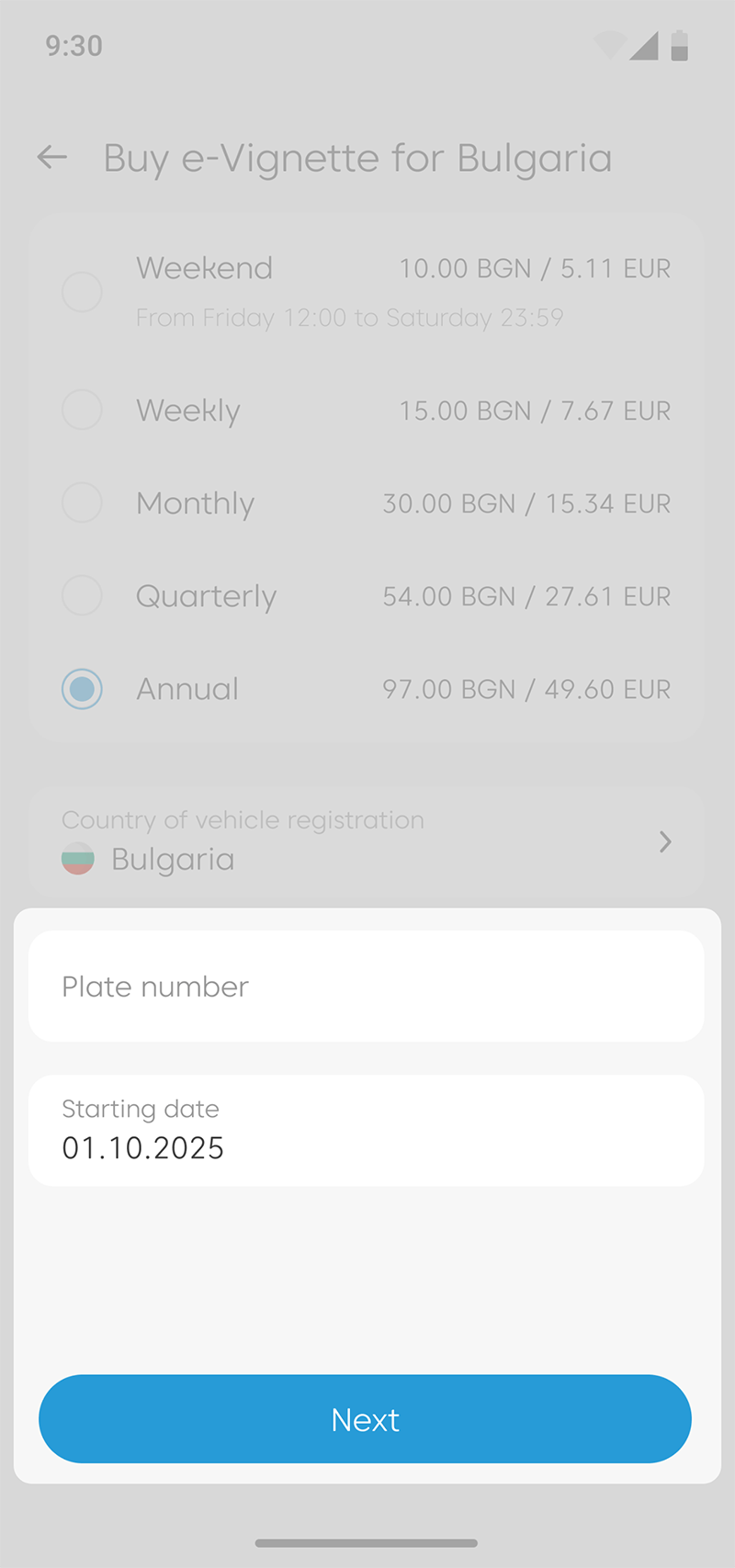 Enter the licence plate number, choose the date of activation of your vignette, and tap “Next”.