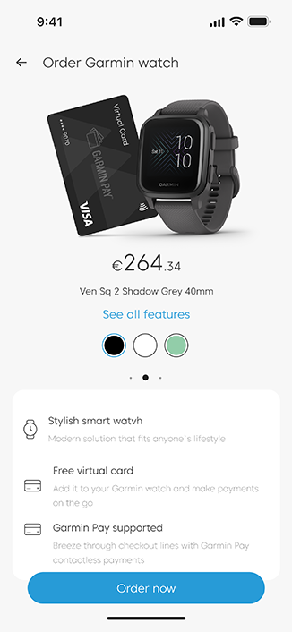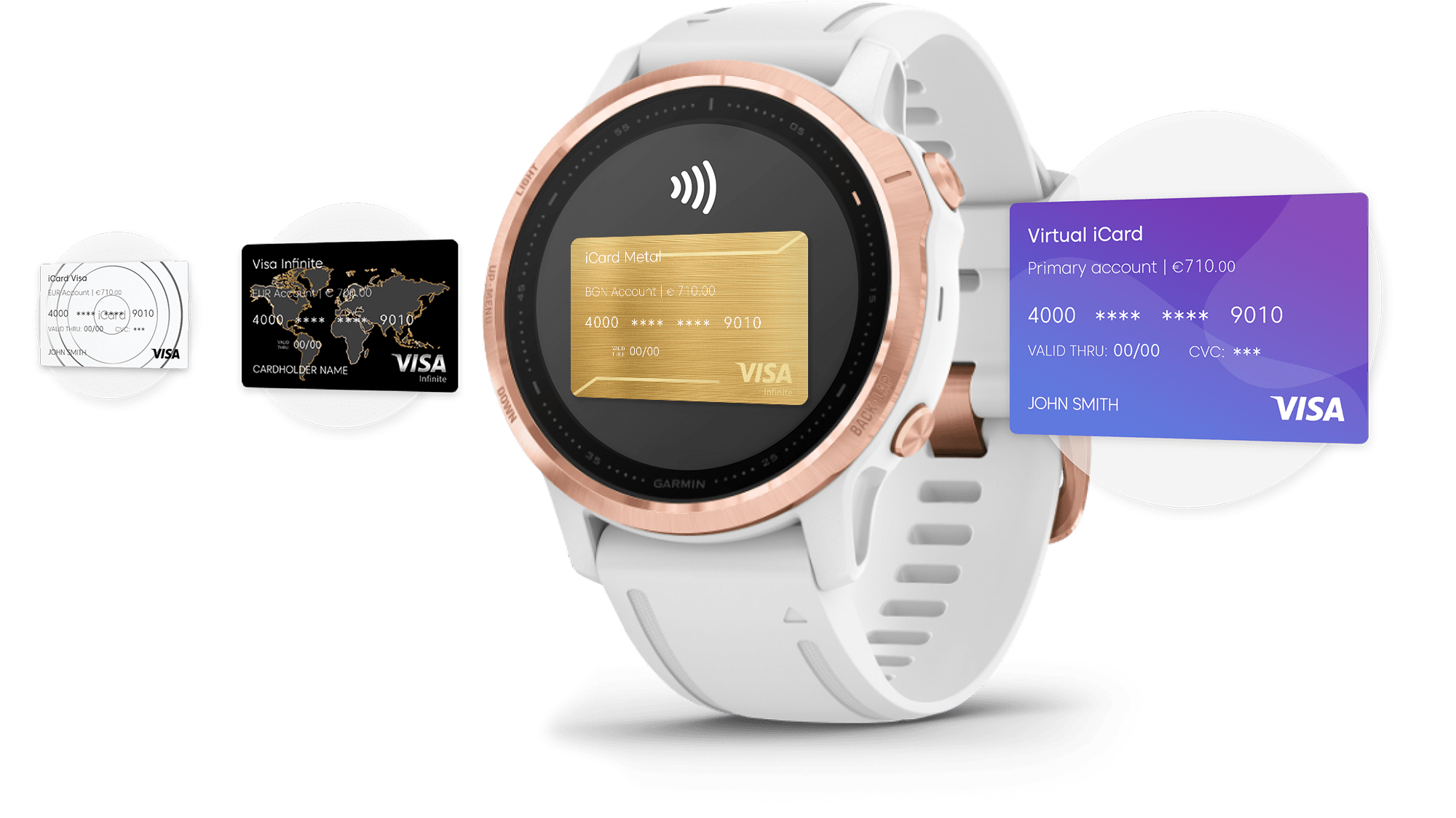 iCard and Garmin have joined forces to give you an even more effortless and elegant way to make contactless payments. Discover the Garmin smartwatch models in the iCard app. They are all equipped with Garmin Pay and they come with a virtual Garmin Pay card that you can link to any of your iCard accounts. Choose your model and color and order your new Garmin watch today.