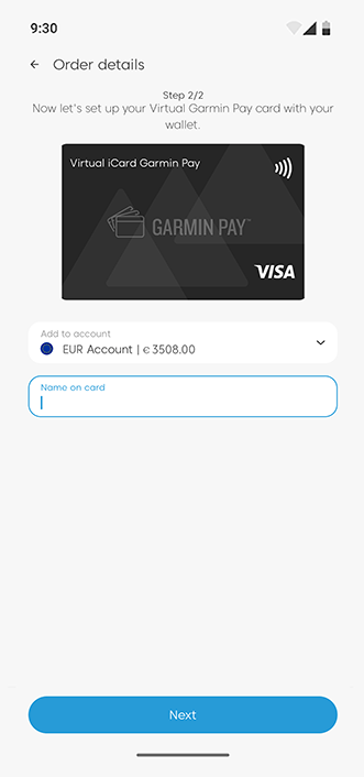 Fill in your delivery details and select to which account you want to link the Garmin Pay virtual card.