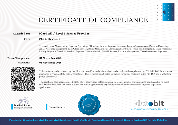iCard undergoes annually through an external security audit in order to maintain ourPCI-DSS Level 1 certificate. The PCI Data Security Standard (DSS) is created by Visa, Mastercard and other well respected debit/credit card providers. It is entirely based on their years-long experience in dealing with countless security threats while securing their customers data. iCard is fully compliant with PCI DSS, which means that we maintain the highest industry security standards, in addition to working with other PCI-certified partners.