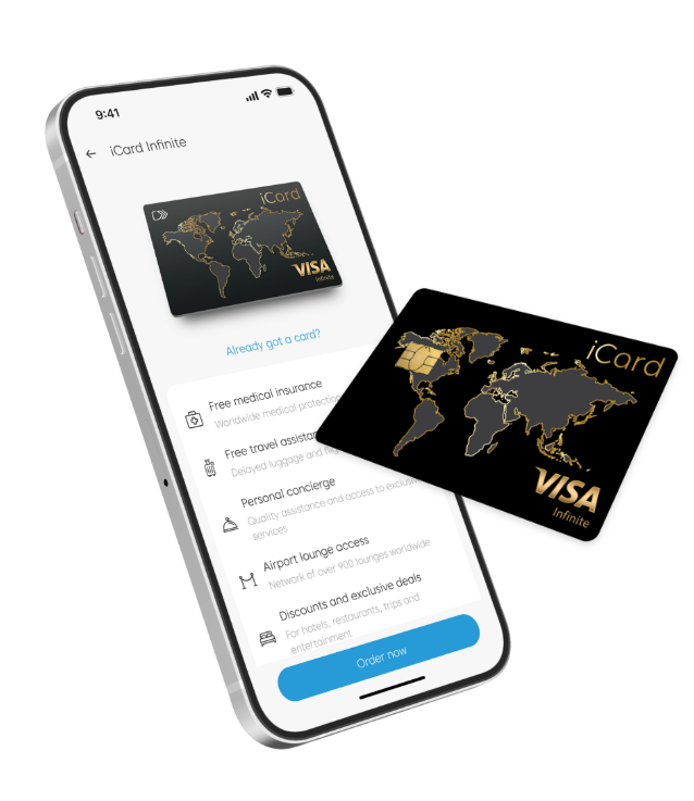 Your iCard Visa Infinite debit card includes travel insurance with coverage of up to 60 000 EUR for your trips abroad. You can activate the insurance policy by making a withdrawal at an ATM or a purchase at a POS terminal with the card when you’re abroad. The policy covers emergency medical and dental care, lost or stolen documents and bank cards, lost or delayed luggage, and more. Just relax – your iCard Visa Infinite has got you covered worldwide.
